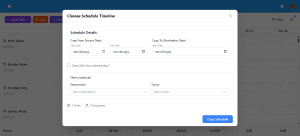The Filter Schedules pop-up allows managers to narrow down the scheduling calendar view to focus on specific employees, departments, shifts, or date ranges. This is especially useful when managing large teams across different locations or roles.