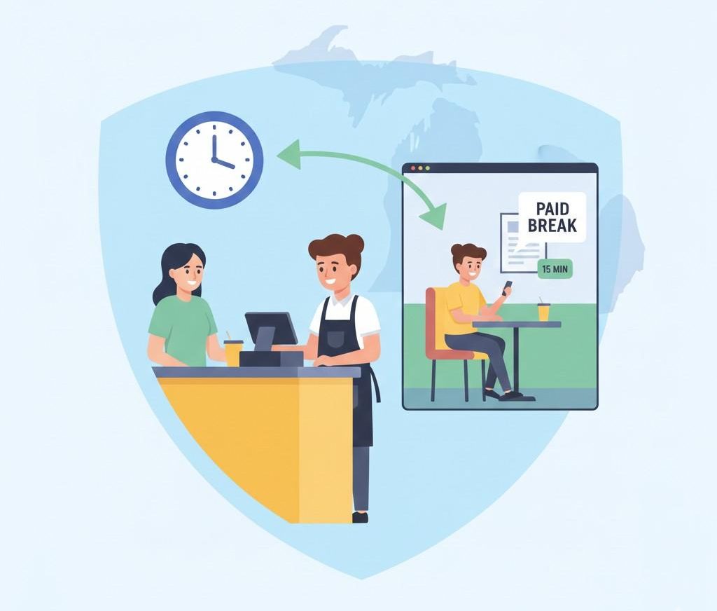 Under Michigan’s Youth Employment Standards Act, minors (under 18) must receive a 30-minute uninterrupted break after no more than 5 continuous hours; time records should reflect the break.