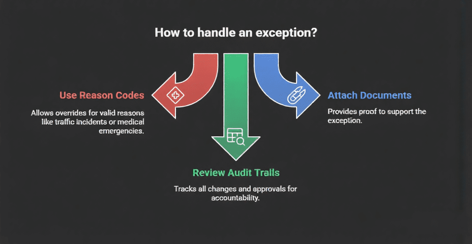 - Reason codes allow manager overrides (like traffic incidents, medical reasons, or weather)