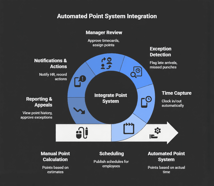 - Time Capture: Employees clock in/out using mobile devices, the web, kiosks, or biometrics. Grace periods and rounding rules prevent minor variations from unfairly triggering points.