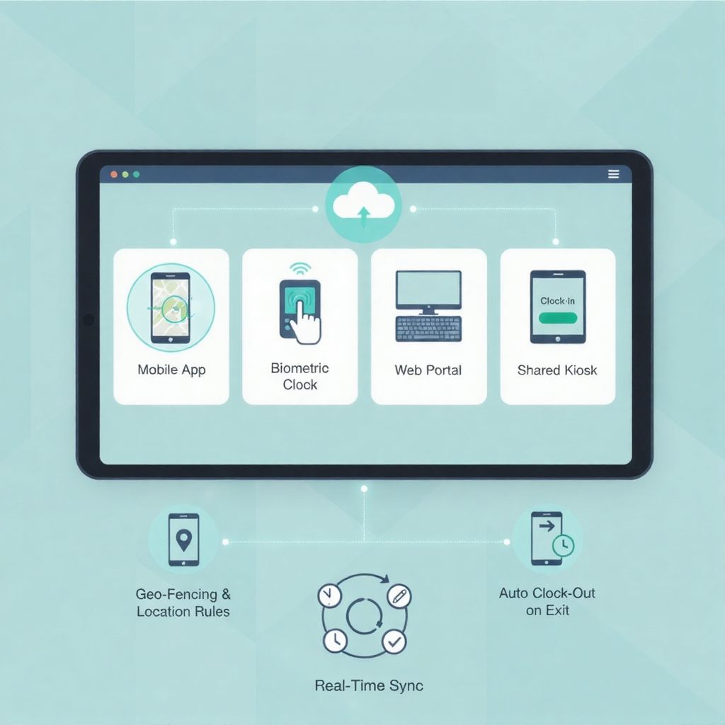- Clock-in options: mobile app, web portal, shared kiosk, and biometric clocks