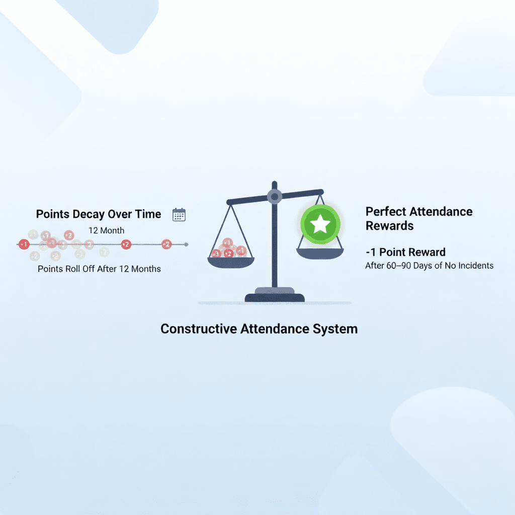 To maintain a constructive approach, many employers allow points to expire (or “roll off”) after a set period, like 12 months from the event. You can also reward perfect attendance; for example, deduct 1 point after 60 or 90 days without incidents. This promotes improvement instead of locking employees into past mistakes.