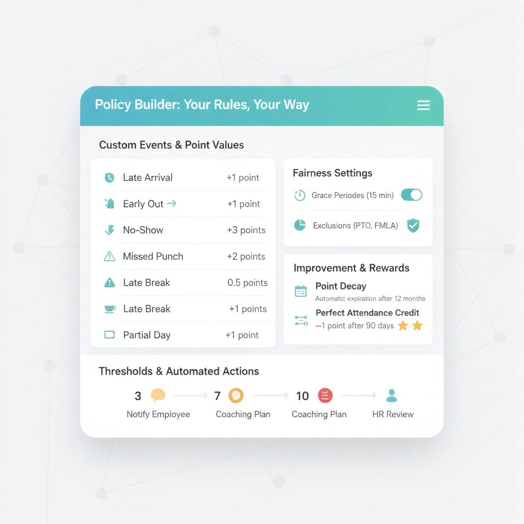 Create thresholds that gradually escalate consequences (like 3 / 7 / 8 points). Link each level to a specific action, such as coaching, written warning, or termination review. Consistency benefits both the employer and employees.Add Decay and Positive Credits