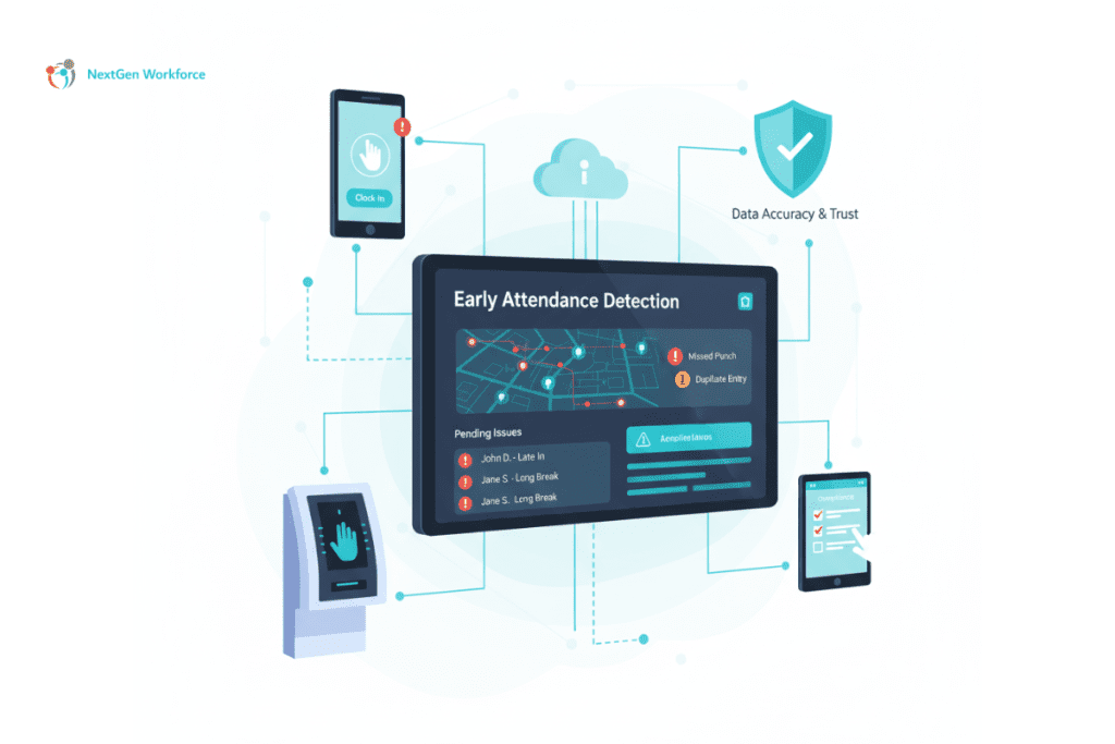 In today’s dynamic workplaces, where employees clock in from offices, job sites, and even mobile devices, tracking attendance has become both easier and more complex. Technology has made it simple to record time, but it has also introduced new challenges: duplicate entries, missed punches, buddy punching, and forgotten check-outs. These small inconsistencies may seem harmless at first, but over time, they can lead to payroll discrepancies, compliance risks, and unfair work reporting. The good news? These issues don’t have to reach the point of correction or penalty. With intelligent time-tracking and proactive systems like NextGen Workforce, organizations can detect and prevent attendance irregularities before they occur. Why Attendance Irregularities Matter Attendance data isn’t just about punctuality; it affects pay accuracy, compliance, and trust. Even minor errors, when multiplied across hundreds of employees and multiple pay cycles, can create: Payroll disputes between employees and HR. Compliance issues under labor laws. Skewed productivity insights for management. Distrust within teams when records feel inaccurate. Most companies react to irregularities after the fact, correcting missed punches, investigating duplicates, or adjusting timecards. But reactive corrections drain HR time and disrupt payroll schedules. That’s why the smartest organizations are moving from correction to prevention. Understanding Common Attendance Irregularities Before we discuss prevention, let’s look at the most frequent types of attendance issues businesses face: 1. Missed Punches Employees forget to clock in or out, often during shift changes, breaks, or remote work. 2. Buddy Punching A co-worker clocks in for someone else, intentionally or accidentally, resulting in false attendance. 3. Early or Late Clock-Ins Without defined rules, employees may clock in early or late, affecting overtime calculations and compliance. 4. Duplicate or Overlapping Entries Manual entries or system errors can record two attendance events for the same period. 5. Time Drift in Remote Environments In hybrid settings, time mismatches occur due to device errors, time zone differences, or offline punches syncing later. Each of these challenges costs businesses accuracy and credibility. The Shift: From Manual Checks to Predictive Detection Traditional attendance systems rely on manual oversight, with managers reviewing timecards, approving shifts, and fixing errors. But with larger, distributed teams, manual supervision isn’t scalable. That’s why modern systems like NextGen Workforce are built on intelligent automation, identifying and addressing anomalies before they disrupt payroll or compliance. Here’s how: 1. Smart Validation Rules: The First Line of Defense NextGen Workforce automatically applies validation rules at the point of clock-in and clock-out. For example: If an employee tries to clock in outside their scheduled location or time window, the system prompts for verification. If a duplicate punch is detected, it’s flagged immediately. If a clock-out is missing after a shift, the system can create a clock-out based on the shift clock-out time. These automated checks create a self-correcting ecosystem for issues rather than being fixed later. Result: Cleaner records, less manual intervention, and a more reliable attendance history. 2. Geolocation and Geofencing: Preventing Misuse For mobile or field-based teams, location-based validation plays a key role in attendance integrity. With NextGen’s geofencing capabilities: Clock-ins are only accepted within pre-approved work zones. Remote punches automatically record GPS coordinates at the time of entry. Managers receive location summaries for accountability without constant oversight. Know more about Geolocation and geofencing. This ensures attendance is both authentic and transparent, especially for distributed workforces. 3. Real-Time Alerts for Anomalies NextGen’s alert system acts as an early-warning mechanism. When irregularities occur, such as repeated late punches, missed check-outs, or abnormal work durations, the system notifies managers in real time. These alerts are configurable, meaning organizations can set thresholds based on their own policies or compliance requirements. Example:If an employee exceeds their daily shift hours or clocks in before an authorized start time, HR and managers get an immediate notification, allowing proactive discussion instead of retroactive correction. 4. Predictive Insights Using Attendance Patterns Over time, data tells a story, and NextGen listens. The platform analyzes attendance trends to identify potential issues before they surface. For instance: Frequent missed punches from a specific site may indicate a training gap or poor network coverage. Consistent early departures from a department may reveal a workload imbalance. Regular overtime patterns might flag potential burnout or policy misalignment. Instead of penalizing, these insights empower HR leaders to understand the “why” behind irregularities and address the root cause. 5. Integration with Scheduling and Payroll Irregularities often arise when systems don’t talk to each other. NextGen eliminates that gap by synchronizing attendance data with: Scheduling tools (so attendance aligns with assigned shifts). Payroll systems (so pay is calculated from verified data only). That means no double-entry, no mismatched records, and no late payroll corrections. Know More: Scheduling Tool By integrating scheduling, attendance, and payroll, organizations gain a single source of truth accuracy that scales. 6. Transparent Access for Employees Transparency builds trust, and trust prevents manipulation. With NextGen Workforce, employees can: View their daily punches and total hours in real time. Request corrections or explanations through the system. Receive alerts for missed punches or potential errors. This shared visibility makes employees active participa